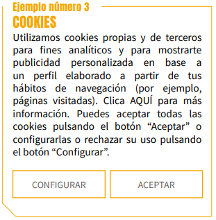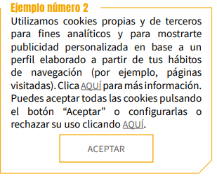 La Guía establece tres ejemplos sobre cuál podría ser el contenido del banner inicial, según el tipo de cookies y sus finalidades. Por supuesto, ninguno alude al uso de cookies para mejorar la navegación del usuario.