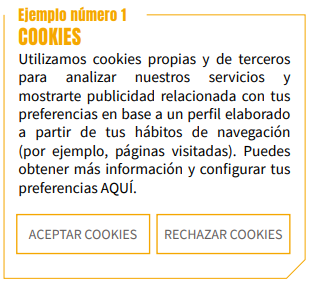 1) Indicar que «las cookies son para mejorar la experiencia del usuario». En la primera capa informativa, es decir, en el banner inicial que vemos al entrar en un sitio web, según la Guía, «No serían válidas, por ejemplo, frases como “usamos cookies para personalizar su contenido y crear una mejor experiencia para usted” o “para mejorar su navegación”, o frases como “podemos utilizar sus datos personales para ofrecer servicios personalizados” para referirse a cookies publicitarias comportamentales. También deben evitarse términos como “puede”, “podría”, “algún”, “a menudo”, y “posible”.»